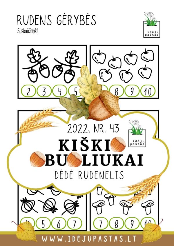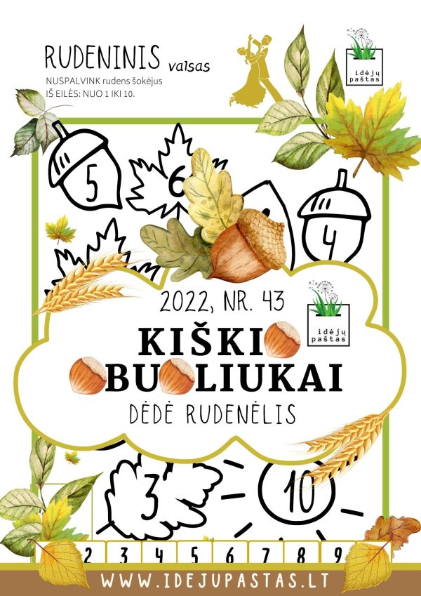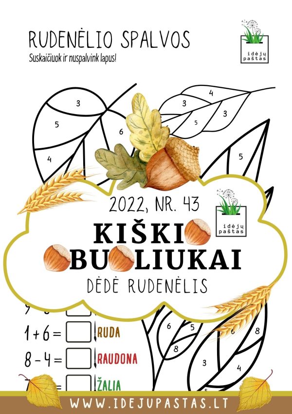 - Lavinamosios užduotys “DĖDĖ RUDENĖLIS” : skaičiavimo, rašymo, skaitymo, girdimosios kalbos, aritmetikos, skaičių sekos, vizualinės koncentracijos, dėmesio sutelkimo, logikos, rankos lavinimo užduotys.
