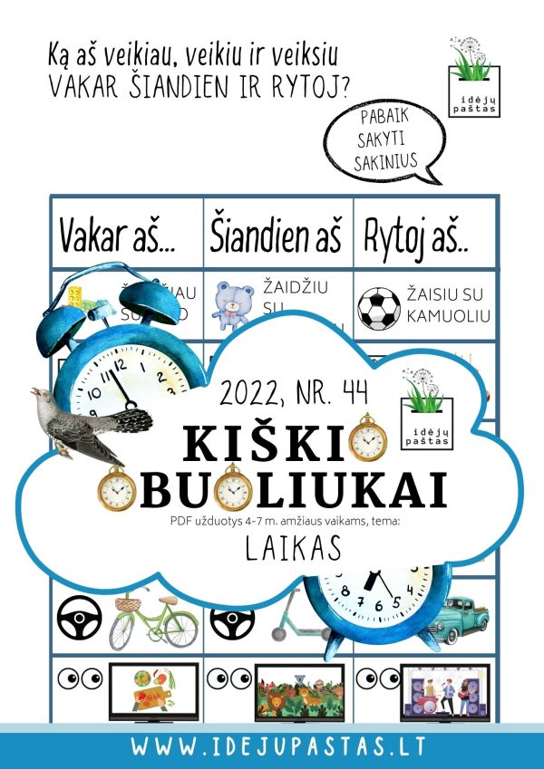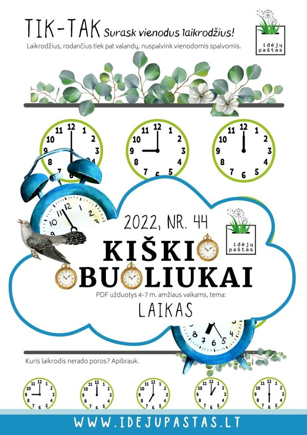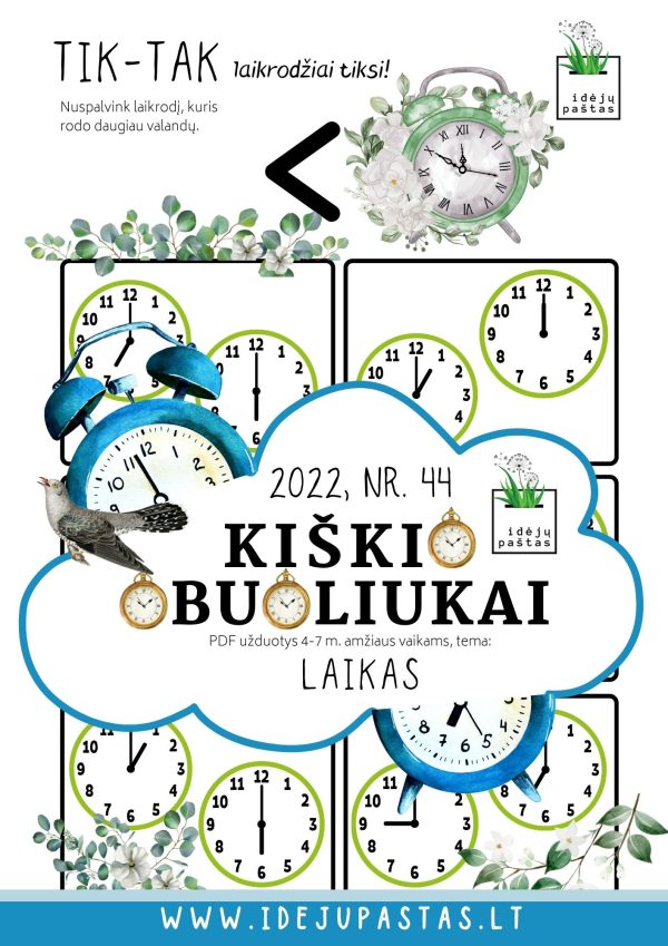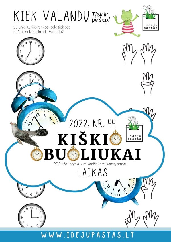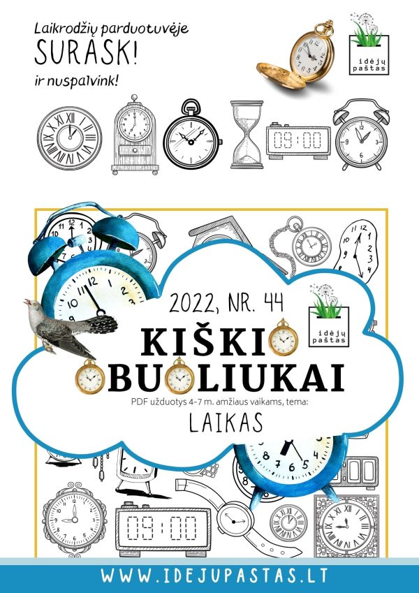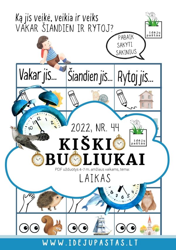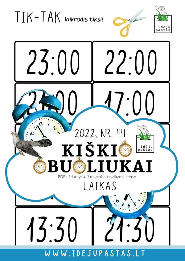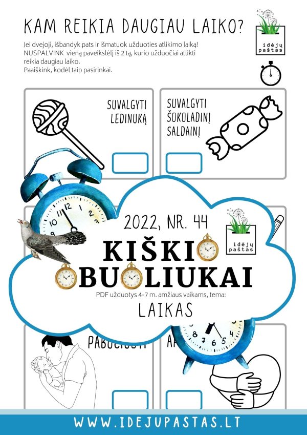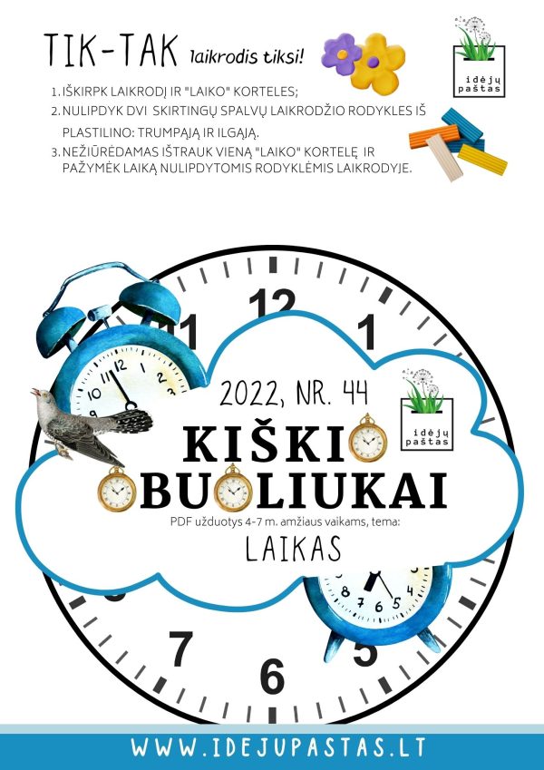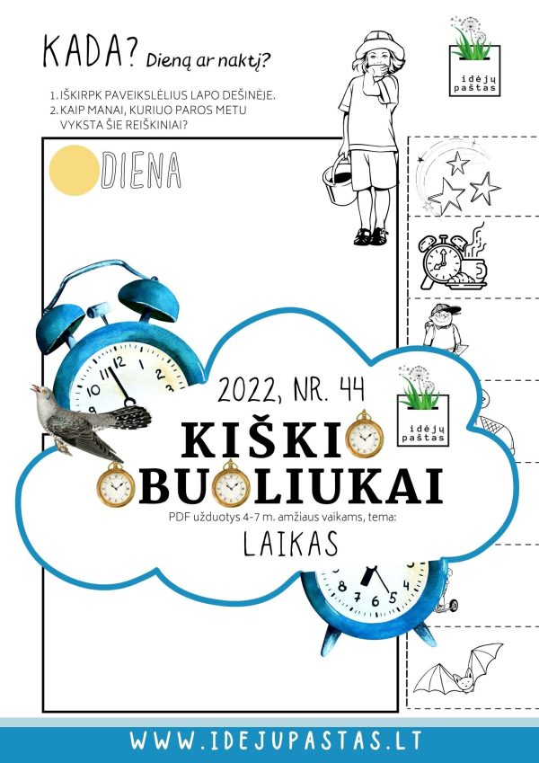 - Informatyvios ir žaismingos PAŽINTINĖS UŽDUOTYS APIE LAIKĄ: laikrodžio pažinimas (valandos, minutės); laiko sąvokų pažinimas (vakar, šiandien, rytoj; diena/naktis).