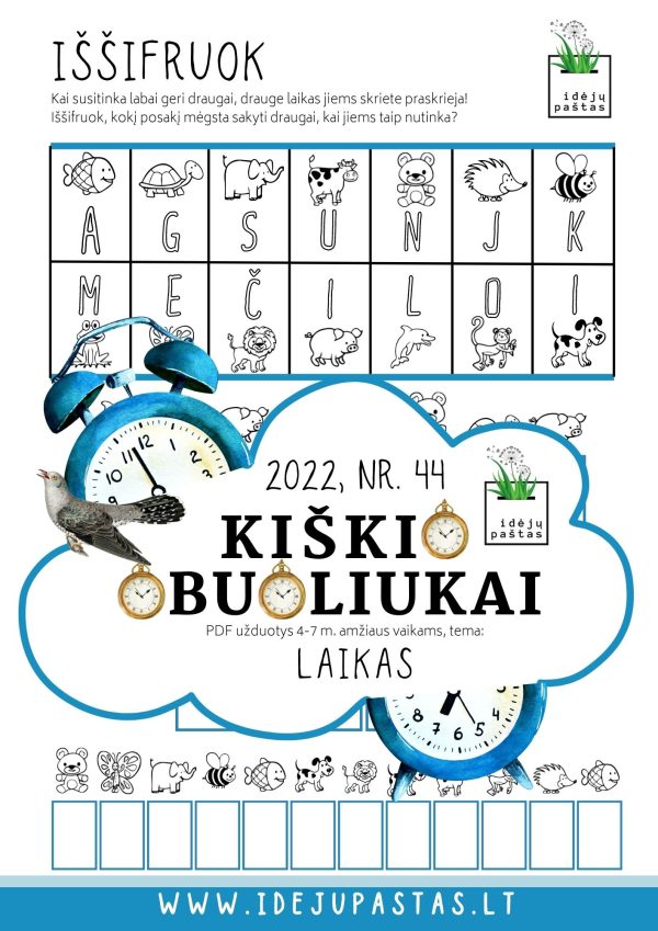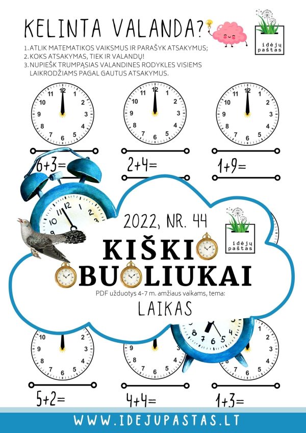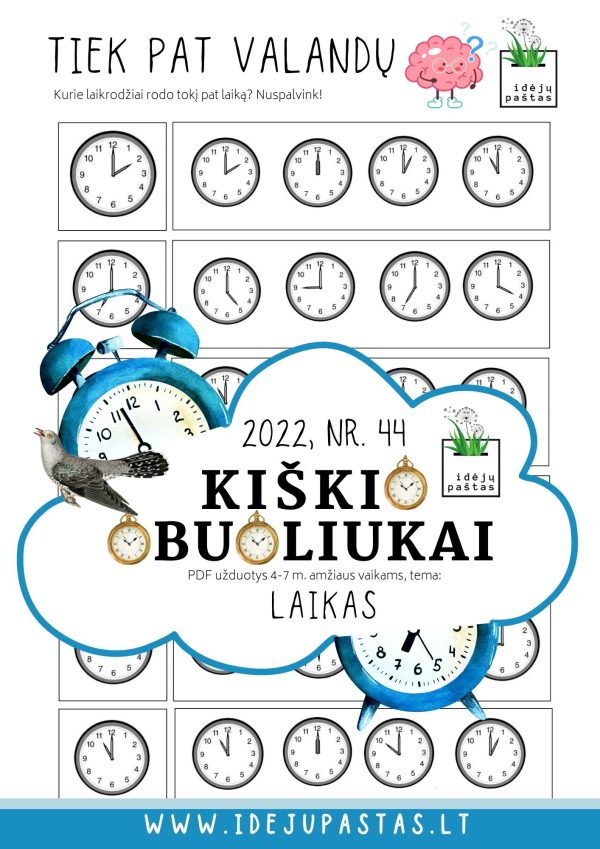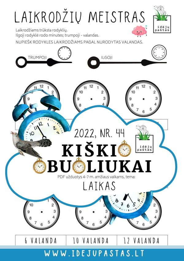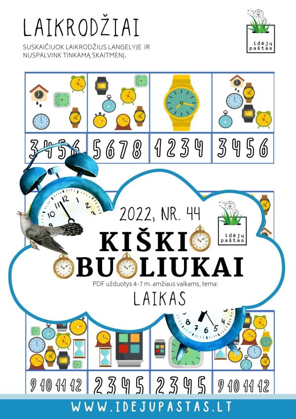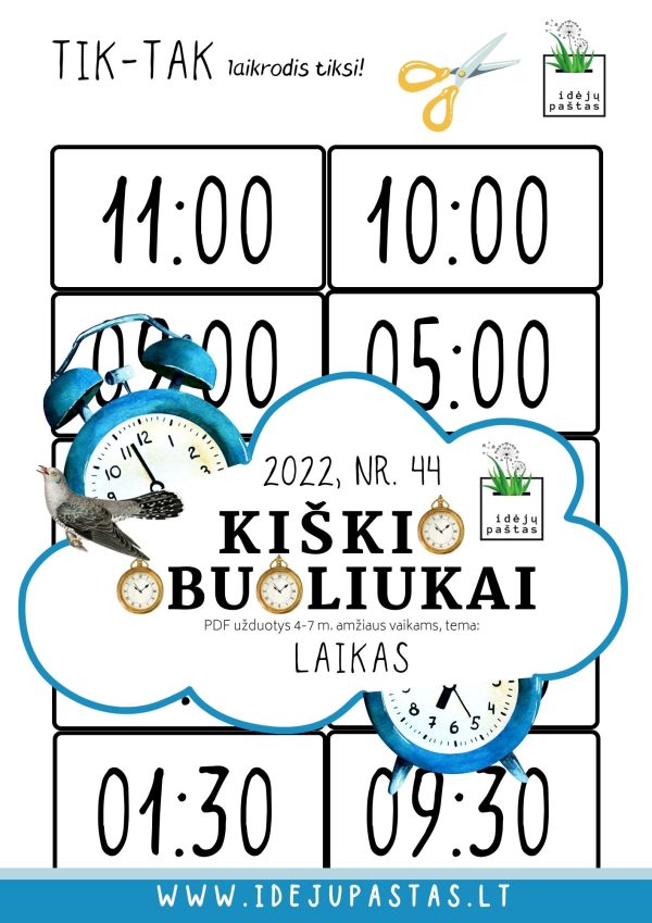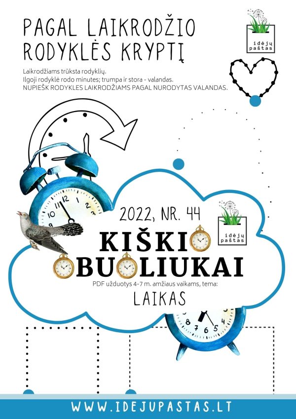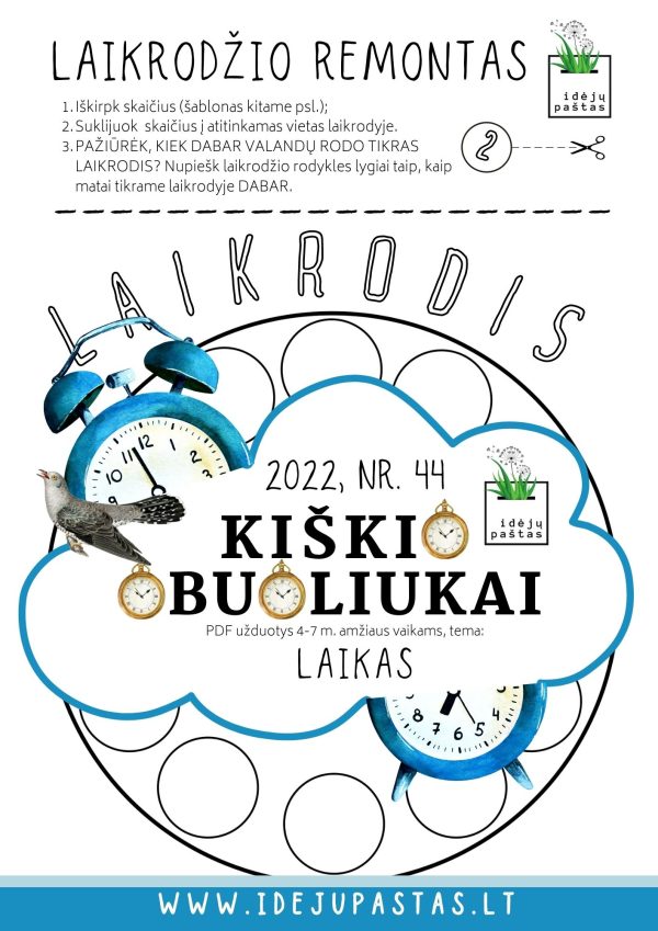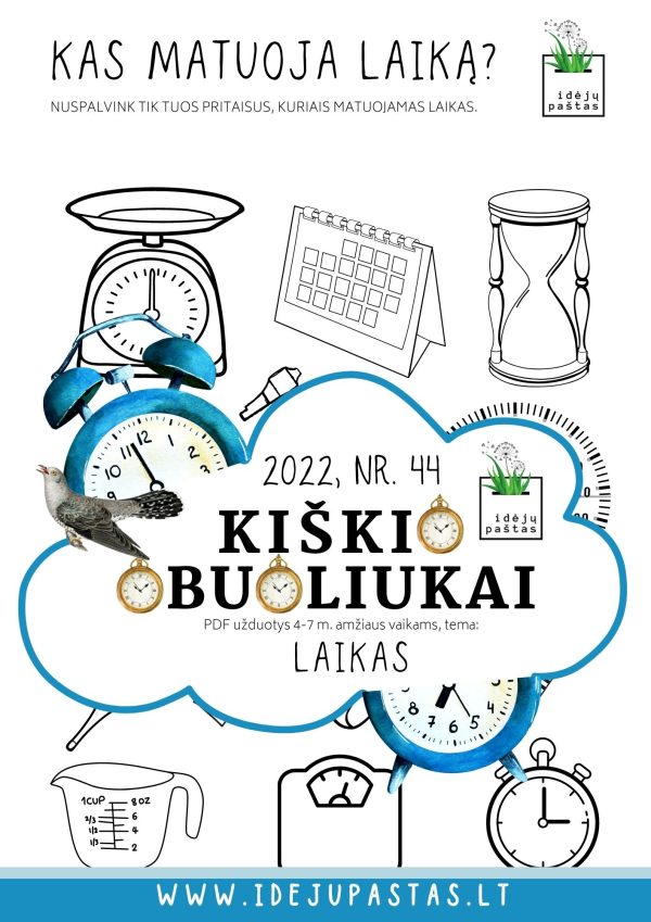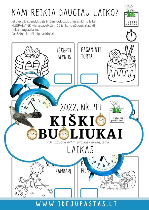 - Informatyvios ir žaismingos PAŽINTINĖS UŽDUOTYS APIE LAIKĄ: laikrodžio pažinimas (valandos, minutės); laiko sąvokų pažinimas (vakar, šiandien, rytoj; diena/naktis).