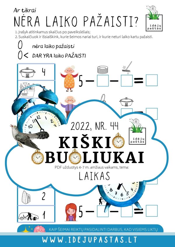 - Lavinamosios užduotys “LAIKAS” : skaičiavimo, rašymo, skaitymo, LIETUVIŲ kalbos, aritmetikos, vizualinės koncentracijos, dėmesio sutelkimo, logikos, rankos lavinimo užduotys.