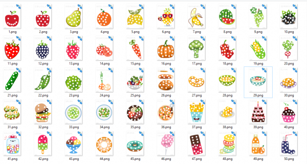 Įvairūs vaisiai, uogos, daržovės, maisto produktai, patiekalai ir vaikų mėgstami gardėsiai pavaizduoti skirtinguose lapuose.